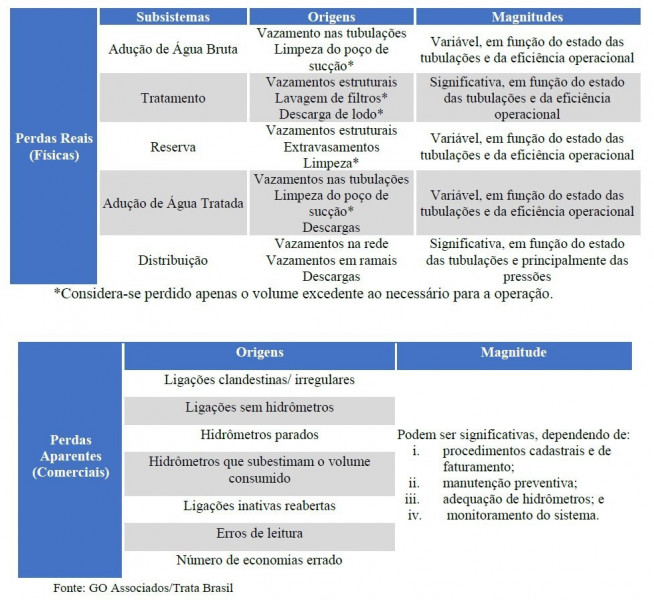 É importante compreender que as perdas de água potável ocorrem de maneiras diversas, sendo as mais comuns os vazamentos, roubos/furtos de água e erros de leitura ou leituras imprecisas devido aos hidrômetros serem muito antigos. As perdas são distribuídas entre físicas e aparentes, conforme a tabela abaixo.