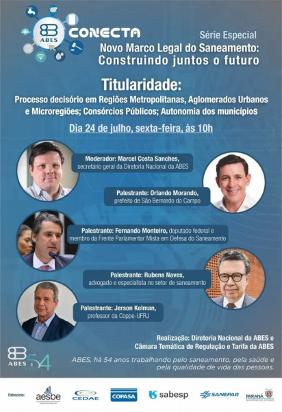 Moderado por Marcel Costa Sanches, secretário geral da Diretoria Nacional da ABES, o webinar contará com a participação de Orlando Morando, prefeito de São Bernardo do Campo, Jerson Kelman, Professor da COPPE-UFRJ, Fernando Monteiro, deputado federal e membro da Frente Parlamentar Mista em Defesa do Saneamento, e Rubens Naves, advogado e especialista no setor de saneamento.