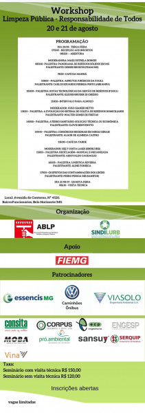 Estão abertas as inscrições para o workshop Limpeza Pública - Responsabilidade de Todos, que acontecerá em Belo Horizonte nos dias 20 e 21 de agosto de 2019. O evento é organizado pela Associação Brasileira de Resíduos Sólidos e Limpeza Pública (ABLP),Sindicato das Empresas de Coleta, Limpeza e Industrialização de Resíduos de Minas Gerais (SINDLURB) e a Federação das Indústrias do Estado de Minas Gerais (FIEMG). O número de vagas é limitado e os interessados podem se inscrever no site da ABLP: www.ablp.org.br