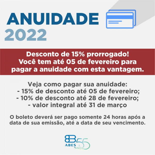 Aproveite essa oportunidade imperdível para quitar sua anuidade 2022. O desconto de 15% foi prorrogado até o dia 5 de fevereiro. Acesse o link para pagamento aqui: https://socio.abes-dn.org.br/associados/sessao/new