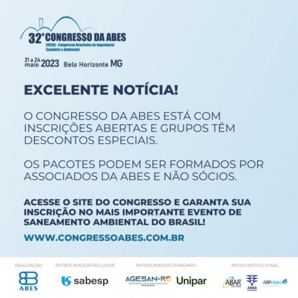 De 21 a 24 de maio de 2023, Belo Horizonte sediará o maior evento de saneamento do país. Promovido pela ABES, o 32ºCBESA terá como tema central o “Saneamento Ambiental: Desafios para a universalização e a sustentabilidade” e será realizado em formato presencial, no Expo Minas.