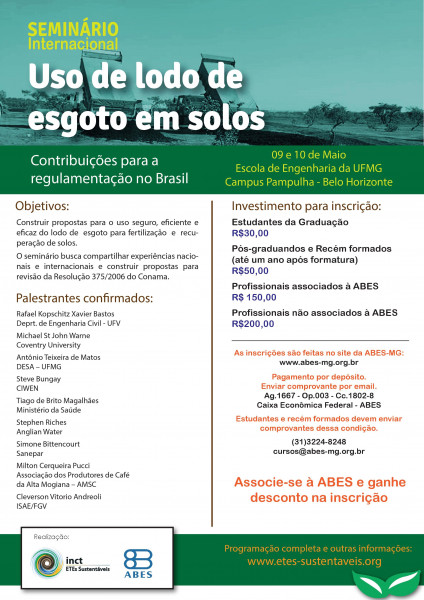 Organizado pelo Instituto Nacional de Ciência e Tecnologia em Estações Sustentáveis de Tratamento de Esgoto (INCT ETEs Sustentáveis) e a ABES , o seminário tem como objetivos apresentar a experiência nacional e internacional no uso de lodo de esgoto em solos e discutir uma proposta de revisão da resolução Conama 375/06 para que tal prática possa ser viável e segura.